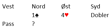 La oss si du starter med en stille og rolig 1 spar med dine 10-11 spillestikk, og øst går innpå med 4 hjerter som makker dobler. Har du og makker klar avtale om hva en dobling betyr på så høyt trinn? Straff? Opplysende?