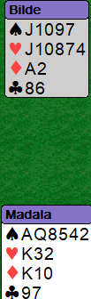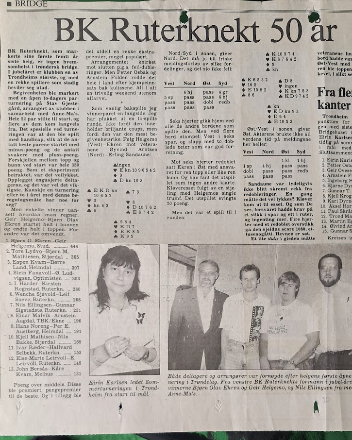 "Kabalkontakt", sa nok mange idet disse kortene kom opp på skjermen og Ø/V meldte 3 grand. Det er jo 2+4+0+3 stikk når kløver dame faller så beleilig.