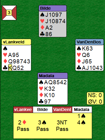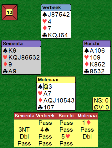 Nord kom inn. Sparen satt som ventet 4-3 fra start så nord kunne ikke ta mer enn to sparstikk i alt før han måtte spille kløver. Det betyr at nord fra start hadde fordelingen 4-3-1-5, noe som øker sjansen for at kløver dame er hos han sammen med fem kløver heller enn hos syd som hadde bare to kløver fra start. Idet kløveren kom fra nord la Lauria liten fra hånden, men da stakk syd med damen og kunne ta en bøtte med ruterstikk, to bet!