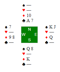 På spar 7 fra øst er syd ferdig mann. Kaster han hjerter dame forsvinner kløver 7 fra vest, så tas kløverfinesse og hjerter knekt er det tiende stikket. Hvis syd kaster en kløver forsvinner vests hjerter knekt, og kløveren er gående ved hjelp av en finesse med damen fulgt av esset.