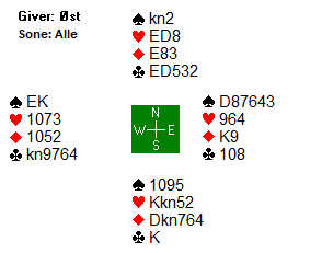 Merk at det er en safevariant i trumf her, hvis trumfen sitter litt annerledes i mot. Det bør spilles liten til knekten hvis øst følger med spar 10 i første runde. Her kommer kongen på og det er ingen problemer, men hvis øst hadde fulgt på med tieren er riktig spill å legge knekten. Om vest kan stikke den sitter fargen 2-1, ingen problemer, og ekstrasjansen spillefører får med seg er at øst har K-Q-10, altså alle trumfene på den siden. Har han det hjelper det ikke motspilleren å legge i en stor trumf i fargens første, tvert om, det hjelper spillefører som kanskje kan overse safevarianten om øst følger med tieren. Sånn som det satt var det ingen problemer i spillet, tolv enkle stikk, men det var problemer i meldingene.