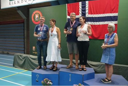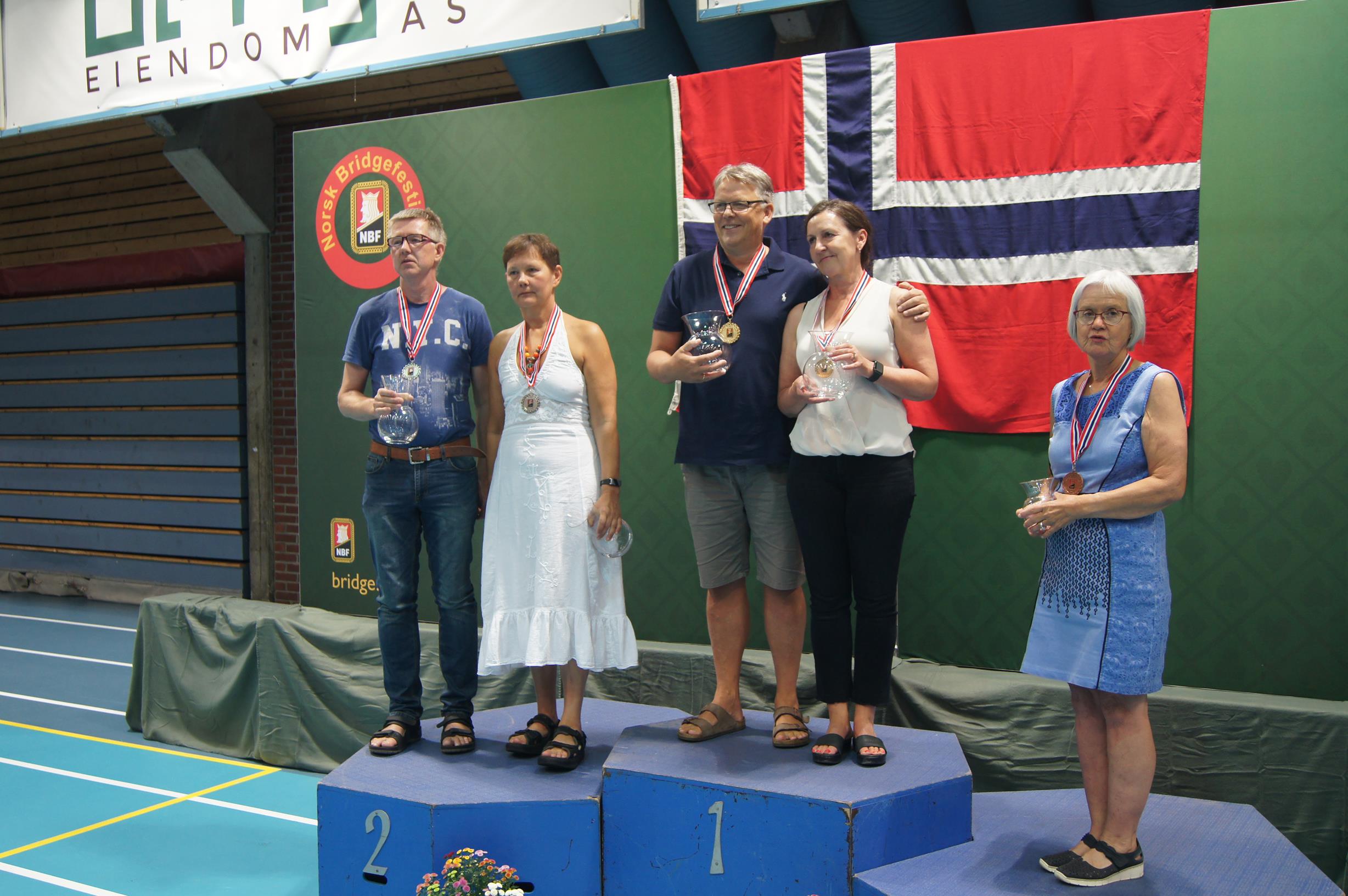 PALLEN, NM MIX PAR: På topp, Egil og Marianne Homme, sølv til Anna Malinowski-Sam Inge Høyland, mens Jorunn Feness står til høyre på det tredje trinnet på pallen. Terje Lie var ikke tilstede under medaljeutdelingen.