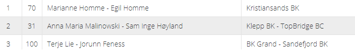 NM for mix par som ble avsluttet søndag ble altså som tidligere nevnt vunnet av Egil og Marianne Homme. Her i bloggen rapporterte vi at Nitter-Breivik tok bronsen, men de står oppført som nr. 4. Jeg mener jeg leste de var nr. 3, men enten har jeg blingset, eller det kom en sen scoringsendring? Uansett, på den offisielle listen står Jorunn Feness og Terje Lie oppført som nr. 3 med liten margin til 4.plassen.