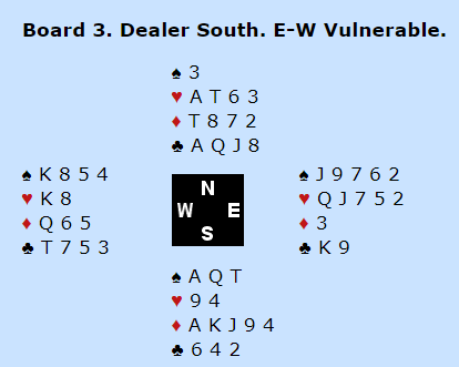 Den israleske spilleren spiltye i stedet spar til finesse. Han håpte nok på 4-2 med Dx eller Kx i Nord. Det vil bare gi en taper i trumf, men her holt ikke den planen og det endte med 1 bet. 12 imp til Norge.