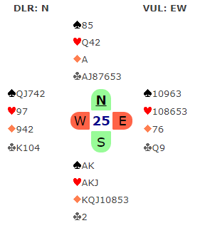 Syd må få spurt om ess, og da må ruter være trumf hvis de bruker Key Card Blackwood. Det er kanskje mulig rett og ssvare 4 grand direkte over nords 1 kløver i åpning, men da må N/S ikke ha den "late" avtalen at "alt" er Key Card Blackwood (for eksempel sist meldte farge som trumf). Med vanlig 4-ess Blackwood får syd vite om kløver ess og ruter ess, og da bør det vel være mulig å ta sjansen på storeslem? Nord kan ha spar dame, hjerter dame eller et mulig ekstra kløverstikk som vil gi det trettende stikket. Her hadde han hjerter dame og da var det tretten toppstikk i grand.