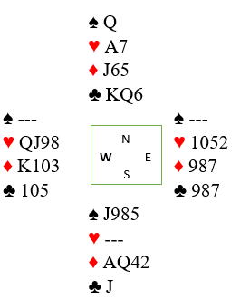 Forskjellen fra om kløver knekt blir spilt er at nå har spillefører fått godspilt tre kløverstikk (to kløveravkast). I dagramsituasjonen kastes en ruter på hjerter ess, og etter å ha tatt stikk for kløver knekt gir nords K-Q i kløver to ruteravkast til. Spillefører har igjen kun ruter ess singel - tolv stikk uten at vest kunne gjøre noe som helst med det!