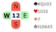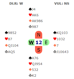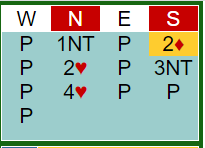 Meldingene gikk slik ved begge bord. Nords 1 grand viste 15-17, og syd har vist femkorts hjerter med overføringsmeldingen 2 ruter før han foreslo 3 grand. Nord korrigerte til 4 hjerter, og øst skal velge et utspill.