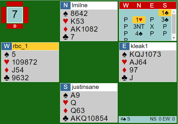 Nå viste hoppet til 4 hjerter kortfarge, men jeg vil tro det også lover fire-korts trumf uten at jeg er helt sikker på avtalene deres. Ok, hun manglet en trumf, men tenkte vel at det kompenserer en del at kortfargen ikke bare er en singelton, men renons. Og honnørene ellers er det all grunn til å like. Uansett, det må vel være lov å si at dette var temmelig tøffe tak?