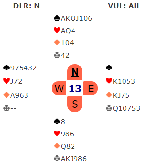 Over 2 hjerter syntes Bakke han var litt for sterk for kun en innmelding, og doblet. Da øst støttet til 3 hjerter fikk Brogeland sagt 4 ruter frivillig. Bakke sleminviterte med 4 hjerter, og da øst stampet i 5 hjerter doblet Boye. Men Bakke trodde på slem og sa 6 ruter.