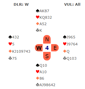 Brekka (øst) hadde gode kort, men han syntes det var litt for drøyt å melde inn 4 spar med KQ tynt femte. Så han passet, og etter pass fra syd også doblet Fuglestad (vest) opplysende. Nå mente Brekka det måtte være slem i kortene, og han hoppet til 5 grand som er såkalt «pick a slam», dvs. det er flere mulige steder å spille. Vest foreslo 6 kløver, og øst korrigerte til 6 ruter som betyr at han har spar og ruter. VEst hadde et greit valg da (mellom spar og ruter) og det gikk pass rundt. Syd skulle spille ut.