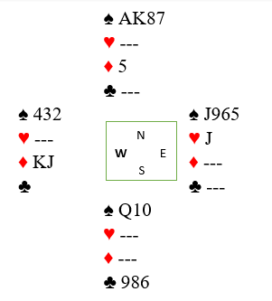 Øst fulgte med sekseren, og knekten kom fra nord. Syd begynte å tenke: kan det virkelig være slik at øst ikke har hjerter ess? Syd måtte ta stilling til om spar knekt var ment som Lavinthal-signal.