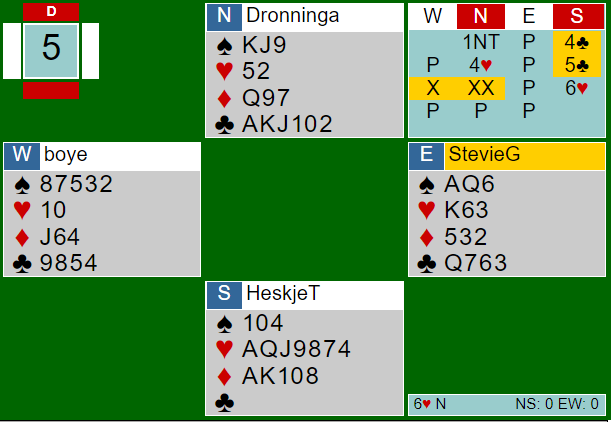Ved ett bord ble det spilt 5 hjerter doblet med en bet, +200 til N/S. To N/S-par fikk spille 3 ruter med ni stikk, N/S +110. I tillegg til TopBridge sin +170 Ø/V for 3 hjerter var det to N/S par som spilte 4 spar doblet med -500. Nord-Norge noterte altså en fet +620 Ø/V i 4 hjerter, og Sven Olai Høyland-Magne Eide (Bergen Ak) noterte en enda bedre +790 Ø/V for 4 hjerter doblet med ti stikk.