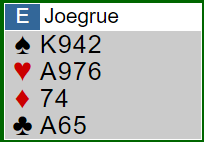 Det må innrømmes at jeg ikke hadde peiling på hva som var riktig. Det er klart nord har kun dobbelton hjerter, og maksimalt tre spar. Om han har enten spar dame eller hjerter dame er det en bra slem. Hvis ikke er det ikke sikkert det står i kontrakt på fem-trinnet engang! Å si 4 spar er vel kanskje likevel greit?