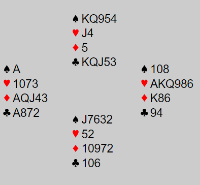 I en av kampene forrige uke fant jeg bl.a. en kamp hvor det egentlig så ut til å være ganske jevnt, men et sterkt lag med Tor Eivind Grude, Christian Bakke, Steffen Simonsen og Lars Arthur Johansen tok etter hvert en ganske grei seier. Det var en haug med slemmer og mulige storeslemmer i kampen. Her er ett spill hvor Grude-Bakke vurderte godt: