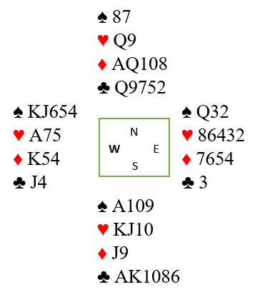 De brukte norske fordelingsutspill. Spar 5 kom ut mot 3NT etter meldingene 1NT-3NT. Øst la på damen, og rutinemessig lasjerte jeg to ganger og vant med spar ess i tredje runde. De første stikkene gikk altså slik: spar 5 ut til damen, nieren fra syd, liten spar tilbake til tieren og knekten hos vest, så spar 4 til esset mens øst fulgte farge