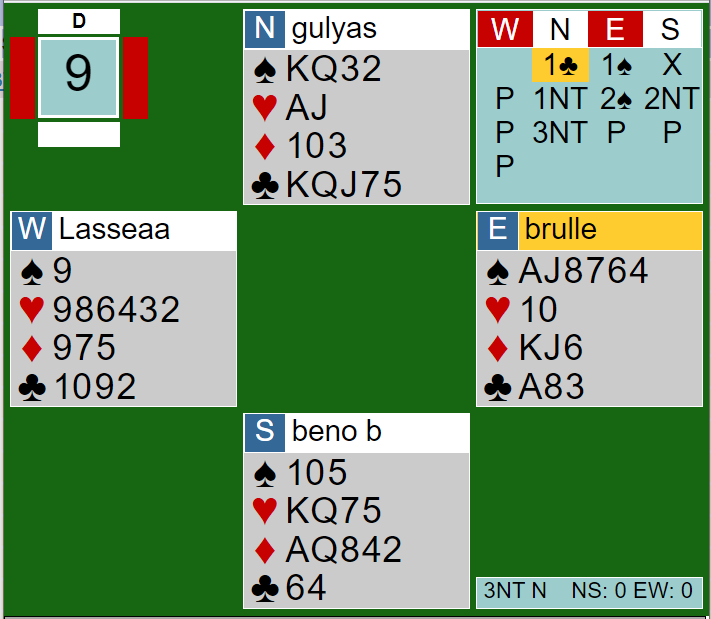 Over 3NT satte Aaseng (vest) trumfen med 4 kløver. Ja, som du skal få se "støttet" han på et vis makkerens kløver med renons! Selvsagt planla ikke vest å spille kløverkontrakt nødvendigvis, men å si 4 kløver ville gjøre det enklere i de videre meldingene.