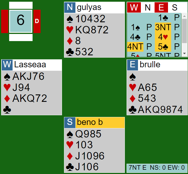 Hvis ruter hadde vært fordelt 3-2 og 7 ruter føket hjem, og kløveren 4-2 slik at 7NT går bet ville det blitt 19 eller 20 IMP til det andre laget (alt etter om det hadde blitt en eller to bet i 7 NT). Altså gir sitsen i minorfargene ca. 40 IMP i sving i dette spillet!
