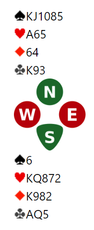 Ukens tema kan være satse eller ikke satse. Først kan du studere Nord sin hånd her, du er i gunstig sone og Øst som er giver starter med 1 ruter (4+ og 11- ca 20 hp). Makker i Syd går innpå med 1 spar og Vest drar uten særlig betenkning opp 3 NT. Hva tenker du om dette og hva gjør du selv?