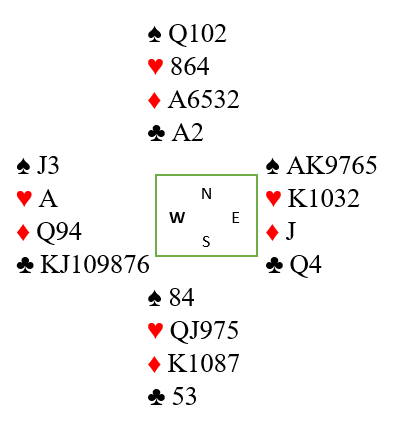 Øst stjal ruterspillet og tok for hjerter konge, så hjerter til stjeling, ruter til stjeling og den siste hjerteren ble trumfet. Jeg kunne trumfe over, men det var uansett originalstikk, og spillefører tapte kun ett stikk i fargene spar, ruter og kløver, Ø/V +620.