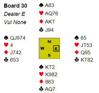 Mine lagkamerater Peter Newell-Martin Reid endte i 4 hjerter etter svak NT fra syd og Stayman fra nord.