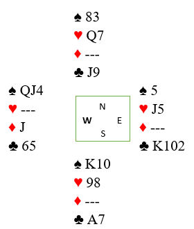 Hvis det spilles med sterk NT åpner syd med 1 i minor, og nord svarer 1 hjerter. Syd støtter til 2 hjerter. Nå er det kanskje mulig for nord å tenke på slem, men en bør ha et apparat (2NT?) for å finne ut mer om åpnerens fordeling. Skulle han for eksempel ha singel kløver er det bra sjanser for slem. Idet syd viser minimum og balansert håbd bør det slå fra seg alle tanker om slem. Men de kan kanskje ende i 4 hjerter.