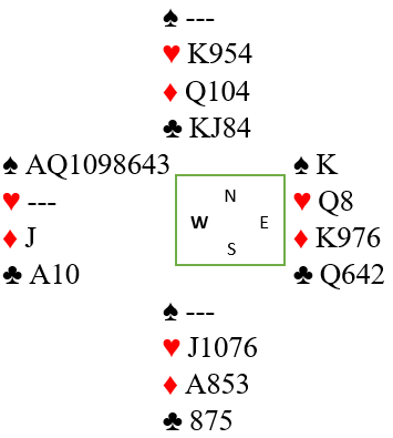 Jeg spilte ru 10 ut men da bordet hadde esset som vant sank håpet om bet litt. Sp D fikk løpe til min konge og nå var det bare en måte å fortsette på. Kløver til makker og ruter til stjeling, men det ble med drømmen, Haltbakken hadde ikke kløver og kunne stjele returen min til Tons kongge. Etterpå var det å dra ut min siste trumf og resten sto. 750 til dem, men likevel vant vi med 21-17. Like mange hadde klart å melde 6 spar etter omtrent samme budserie men hopp til 6 spar fra Vest, ikke helt urimelig sats.
