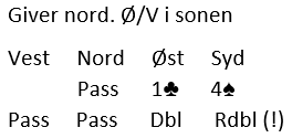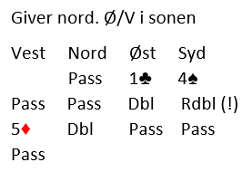 Tirsdag i Fredrikstad BK ble spillerne satt litt ekstra på prøve. Det gjalt et motspill. Arne Marthinussen (Ø) åpnet med 1 spar. Åsmund Stokkeland (S) ogFFred Hansen(V) passet og Sverre Johnsen gikk deretter innpå med 2 hjerter, Arne gjenmeldte 3 kløver som viste ekstra styrke men Åsmund hoppet så direkte til 4 hjerter med pass rundt. Arne vurderte selvsagt en dobling men mye tydet på fordelinger imot.