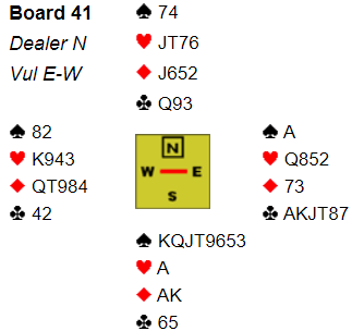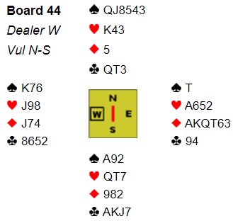 I gunstig sone åpnet Hans Petter Stavrum(Ø) med 1 NT og Jan P. Johannesen svarte selvsagt 2 ruter som lover 5+ hjerter. Stavrum svarte 2 hjerter og Jan regnet at med 15-17 hp kunne det stå lilleslem sevl om de med 17 i Ø da bare ville ha 31 hp til sammen. Derfor en optimistisk 4 NT fra Jan P. og svar 5 kløver, 3 ess der hj K kan være det ene. Likevel- 6 hjerter kom avsluttende bud fra Johannesen. Hva synes du, er dette en grei slem å komme i med sp J ut fra Nord? Ja, siden Vest har gode toppkort vil 12 stikk vinnes hvis det ikke er taper i trumf eller hvis kl K er i Syd. I alt blir det pene 75% vinnersjanse og det regnes som bra.