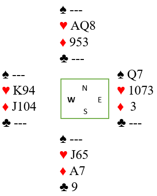 Spillefører må sjekke om hjerterfinessen går, enten tidligere (kanskje best), eller nå. Så i diagramsituasjonen spilles hjerter til damen. Siden damen vinner stikket, begynner det å lysne veldig. Nå kan spillefører om sitsen leses korrekt spille ruter til esset og ta for kløver 9. Da er vest ferdig. Hvis han kaster en ruter forsvinner hjerter 8 fra nord. Så spilles ruter som godspiller nords siste ruter, og de to siste stikkene går til hjerter ess og det godspilte ruterstikket. Hvis vest kaster en hjerter idet kløver 9 spilles forsvinner en ruter fra nord. Liten hjerter spilles, og den nå single kongen kommer på - hjerter knekt står.
