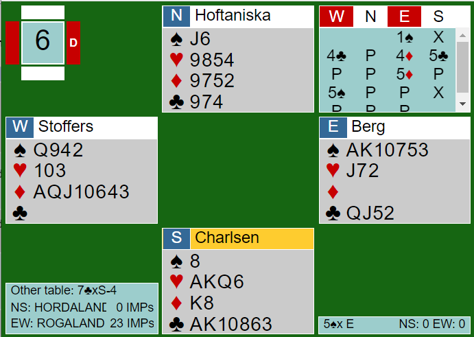 Her står 6 ruter men også 6 hjerter og Jan Erik Holm- Tore Trondsen og Morten Olsen- Nils Haakensen fikk delt topp for 6 ruter mens resten spilte 4 hj/3 NT (N!) med 13 stikk.