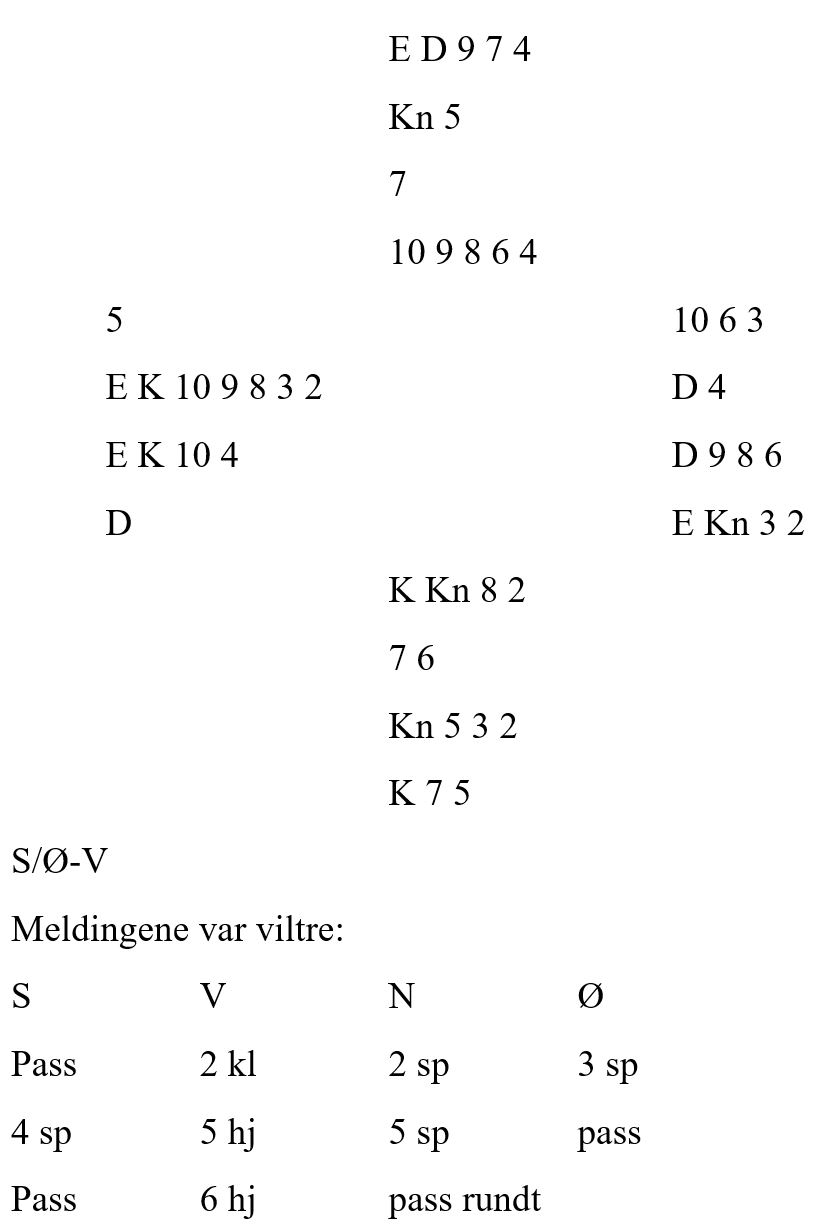 Hun tok for den siste trumfen hos syd og stakk ikke over. Da likte hun kanskje ikke helt at begge fulgte slik at trumfen satt 3-2, for nå måtte hun altså spille seg hjem i spar. Og sparen satt 6-1! Men heldigvis hadde ikke vest som hadde singel spar fra start den siste trumfen. Så inne på spar konge fikk hun tatt ut østs tredje trumf og kunne kaste to ruter på spar etterpå, +1430.