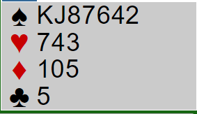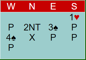 Øst åpner med 1 hjerter og Vest som har 5 honørstikk (i «gamle dager» ble det brukt som mål for å telle opp sine sikre stikk der A=1, K= 0,5, AK= 2 osv) men i moderne meldeteknikk er ny farge minst krav for gjenmelding fra makker. Tone Annette i Vest svarte derfor bare 2 kløver og jeg gjenmeldte 2 hjerter, nå oftest 6+. Deretter satset makker med 4 NT- spm i hjerter men fikk bare 5 ruter (1 av de 5 «essene») men så avslutter vel dere ogå med 6 hjerter? Der gjorde vi også. Spar kom ut til bordets konge. Trumfbehandlingen er essensiell her. De fleste spiller hj 5 og tar finesse med damen men Syd har kongen. Etter kryss etterpå til kløver A i bordet kommer hj 5 men Nord er utsolgt! 1 bet er uunngåelig, men lilleslem har ca 75% sjansee. Bere ett par fikk bremset i 4 hjerter som ga topp. 6 NT her var et dårlig valg for det endte opp med betelass etter sparutspill og fortsettelse der. -4. Syd hadde hj KJ2 og det holdt til å bete oss.