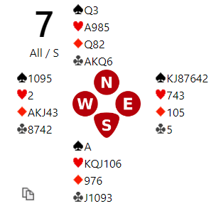 Vi fikk enkel prøve, for etter svar 1 spar fra meg hoppet Terje til 3 hjerter. Det viser sterk hånd med meget lang farge. Jeg trengte ikke mer da, gikk på med 4 NT og da svaret 5 hj hom som lover to keycard og her er det sikkert AK i hjerter, var saken klar.5 NT bekrefter 5 ess, er storeslemsforsøk og makkers 2 konger gjør at vi da kan melde 7 hjerter! Det gjorde Solli, men så kom jo kuleramma fram for opptelling av stikk, og 13- grensen ble trygt passert så 7 NT kunne spikres. Bare ett borzd til var der mens et anndet stoppet i 7 hjerter. Klarte dere å melde storeslem og også i grand?
