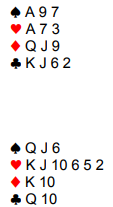 Det staret altså med 1 kløver (øst), pass fra syd og vest svarte 1 ruter ved det ene bordet. Nord passet, og øst sa 1NT. Syd passet igjen, og nå brukte vest XY, dvs. han sa 2 kløver som ba åpneren om å melde 2 ruter som vest passet på. Alt vel å bra for Ø/V, men det var ikke slutt. Åsmund Stokkeland var helt klar over at makkeren godt kunne ha en god hånd med en slik type fordeling at han ikke kunne melde verken første eller andre gangen. Så N/S kunne godt være litt "robbet". Stokkeland kom nå med en opplysende dobling, perfekt med 4-4 i major, men litt uvanlig at man melder seg på etter at alle de andre har meldt tre ganger! Enda mer uvanlig er at makkerparet som har passet hele tiden da melder utgang. For det gjorde Johnsen med syds kort, han hoppet rett til 4 hjerter!