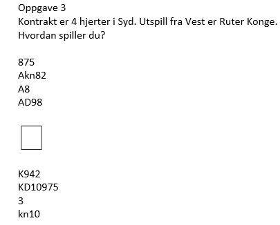 Det var ulikt nivå på disse oppgavene. Men selv de enkleste oppgavene har poeng som selv ganske erfarne spillere kan bomme på om det forekommer i praktisk bridge. Denne første var kanskje en av de enklere oppgavene, men med et poeng som mange turneringsspillere overser.
