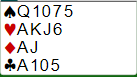Vest har i alle fall lang god ruterfarge og sterke kort, og øst lang hjerterfarge. Og vest har meldt 3NT underveis. Uansett skal du altså finne et utspill mot 6NT.