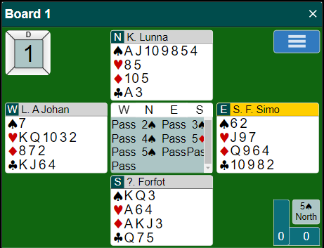 Du hørte et meldingsforløp som kanskje ikke er til så stor hjelp for nord, og kanskje også litt usikkert for eksempel med hensyn til østs 4 kløver., og østs 5 kløver (har dessverre ikke den informasjonen).