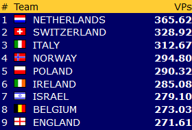 Norge SENIOR ser ut til å klare det som nok var hovedmålet deres på forhånd, topp-8. Intet er sikkert med fem kamper igjen å spille, men marginen ned til den triste niendeplassen er nå 25 VP. Ser en oppover på listen er det kun 9 VP opp til bronse!