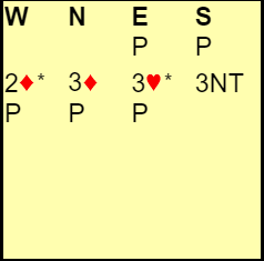 Hvordan vil du melde som Øst etter åpning 1 kløver fra makker, 1 hjerter innpå fra Nord og 1 spar fra deg. 2 hjerter fra Syd og så hopp til 3 spar fra Vest. Videre?