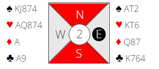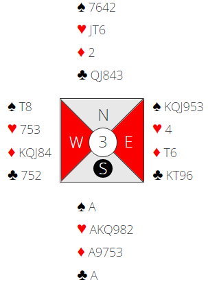 Hansen tok slem- initiativ selv om makker nok hadde vist relativt beskjeden styrke. Med 5- ess Blackwood der svar her var med spar som trumf og 5 hjerter følgelig viste 2 av de 5 keycardene kunne Syd legge kontrakten i sin gående langfarge.