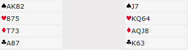 Åsmund sitt halvsterke innhopp fungerte godt her. Ingen kan vel egentlig kritisere Jørn Fjæstad for å gjenåpne i Øst (Vest kan jo ha hatt en straffepass og vente på å passe ut 2 hjerter for straff). Men Gunnar Pettersen fikk nå valget mellom å betale ut 870 i 2 hjerter doblet eller å forsøke å slippe unna. Men da satt Johnsen klar med et rødt kort med sin gode trumfbeholdning. Motspillet var greit. Åsmund spilt ut sin single trumf (Nord er markert med lengde) som gikk til esset og Jørn startet på sparen som løp til esset i Nord. Så tok de sine tre stikk i kløver fulgt av hjerter fra Johnsen til konge og ess. Innkassering av sp K før hj D opp fullbyrdet siden Fjæstad måtte stjele. 4 stikk i trumf samt et stikk i spar var alt Jørn kunne skrape sammen. -800. Ved det andre bordet spilte Rene Eriksen (Syd) 2 hjerter med 9 stikk. Der var Magnus Larssen (Ø)- Flemming Johnsen (V) passive nok. Thomas Feilberg Jacobsen (Nord) kunne dermed noterte 12 imp ut på spillet. Av de 28 spillene i kampen ga de resterende 26 bare 14 imp pluss til for vinnerlaget.