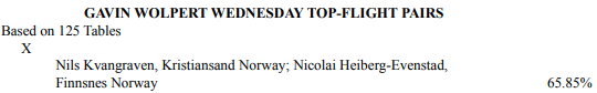 Odd Harald og Geir hevder å ha klippekort på topplasseringer i simultanturneringer, og tirsdag fornektet de seg ikke. I skrivende stund ligger de på en fin 10. plass av 310 par. Sjøl synes jeg det er enda artigere at Toril og Per Arne kom på en 35. plass! Vel fortjent til begge to!
