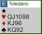 Syd ved dette bordet lasjerer første ruteren. Øst vinner med kongen, og spiller ny ruter opp igjen til ditt ess. Du sender i vei kløver knekt, i håp om at finessen lykkes. Dessverre, denne gangen (igjen?) lykkes ingenting. Korts så nemlig slik ut: