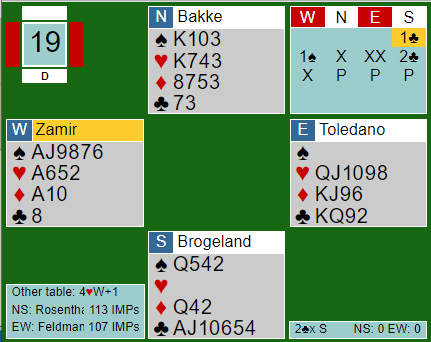 Inne på kløver konge tar vest for tre ruterstikk, og deretter må øst få to hjerterstikk. Sammen med de to stikkene i starten går syd bet.