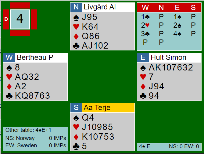 Begge parene klarte via godspilling av sparen å vinne alle stikkene. De andre stoppet i utgang