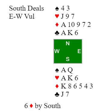 Atle valgte å «underslå» major 4- kort i hjerter og krevde med svar 2 kløver so, Arild gjenmeldte 2 ruter på. Da Øst deretter svarte 3 ruter var det minst sleminvitt og via noen kontrollmeldinger nådde de fram til spill i 6 ruter som bare ett annet par hadde meldt. Spillet var greit og med sp J ut fra Nord klarte Arild å vinne 13stikk, kløverfargen lot seg enkelt godspille. Nord hadde sp J1093- hj K7542-- ru 10- kl KD10, der satt Trond Juliussen med Lars Helgesen som makker. Topp for Ø-V.