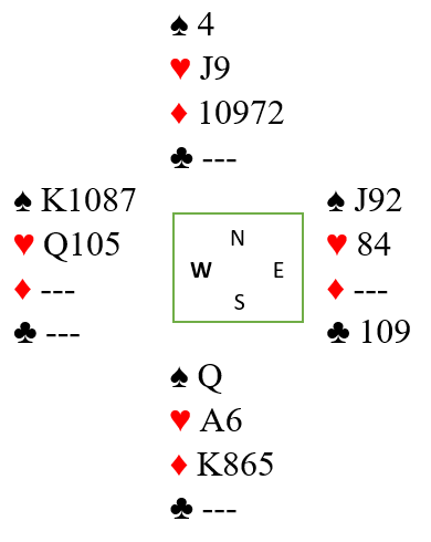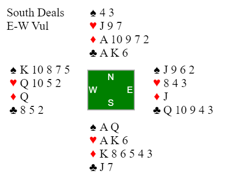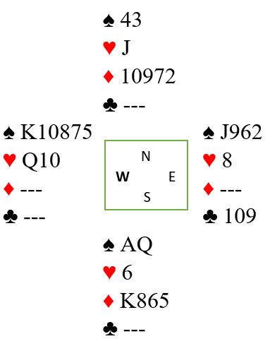 To andre par satset friskere, Ottar Frode Austnes (N)- Jan Løvfall (S) og Tore Heitun (N)- Christer Heitun (S) dro til med 7 NT. Av Syd. Er sparfargen «snill» og sitter 3-3 imot står dette, men her viste dert seg av den var 10xxx mot J så Vest hadde sikkert hold. Tror dere at slaget da var tapt for Syd, ruterfargen var gående? Vår felles venn «skvisen» kan virke bare de sentrale honørene, her i hjerter sitter optimalt gunstig. Aktuelt hadde Vest sp 10543- hj KJ943- 6- 853 og da Vast klarte å unngå utspill i hjerter valgte Syd å ta sk K og D der sitsen ble avdekket. Men da kl K og deretter alle stikkene i ruter ble fulgt av kl A og D var Vest nødt til å sake fra sp 105- hj KJ i 10 stikk og var skvist. Det ga delt