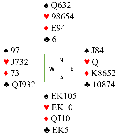 Scorene varierte veldig, men bare mellom +80 til N/S og +110 til Ø/V som kan vinnes i delkontrakt i kløver ved å gjette riktig i kløverfargen. Det må spilles til finesse med kløver til nieren første aller andre gang, ikke satse på en honnør foran og spille liten til knekten, så liten til damen andre gangen, da blir det tre kløvertapere). Å spille for eksempel 2 hjerter som N/S med en bet ville gitt middels. To par delte toppen Ø/V med +110 for ni stikk i kløverkontrakt, og det ga hele 96,9% til Ø/V.