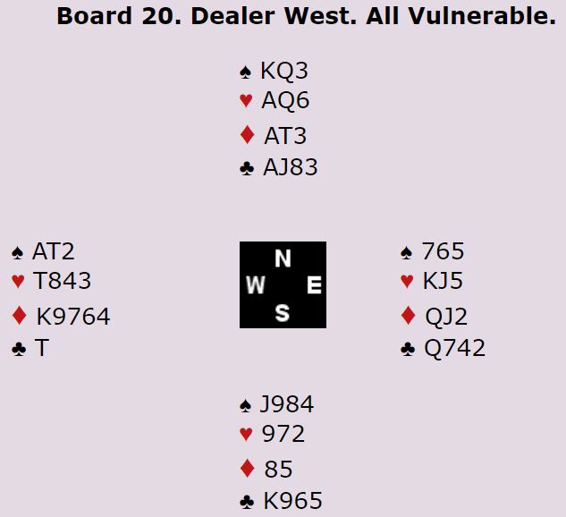 Marianne Harding (syd) åpnet med 2 spar, femkorts farge pluss en minorfarge og 3-10 poeng. Vest passet og Ann Karin Fuglestad klinket til med 4 spar direkte med nrods kort. Øst sa 4NT, to steder å spille. Vest valgte da å si 5 ruter som øst korrigerte til 5 hjerter og viste dermed ruter og hjerter. Nå løftet vest til 6 hjerter, en tvilsom avgjørelse etter min mening. En bør i slike situasjoner ta litt høyde for at makkeren har strukket seg for at de ikke skal bli utmeldt. Men poenget er at de ikke vet sikkert, N/S har tatt bort alle muligheter for å undersøke.