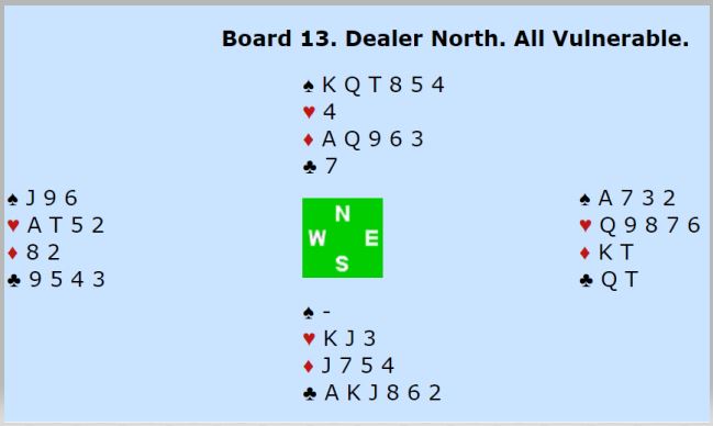 Den norske nord meldte 3 spar - sekskorts farge. Da sa syd 3NT, Nord kunne ikke vite sikkert om han skullle ta ut. Han passet og de skulle spille 3NT etter dette meldingsforløpet: